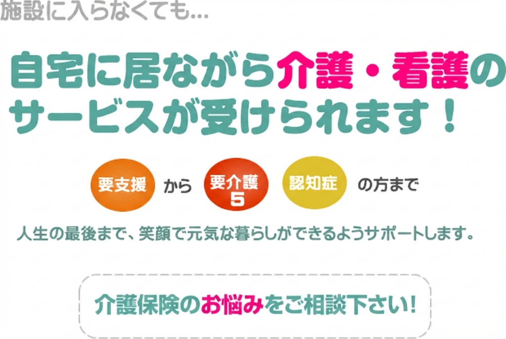 介護度に応じて、デイサービス、訪問介護、訪問看護、ショートステイを組み合わせたサービスです。